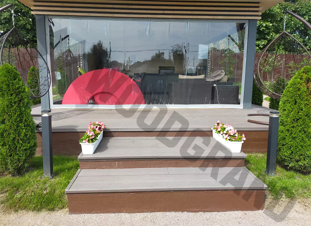 Задумка была, сделать единое напольное покрытие снаружи и внутри беседки, но для этого необходимо было подобрать универсальное покрытие, не требующее тщательной обработки от грызунов, более влагостойкое, чем дерево, и, конечно же, красивое. Остановились на ДПК, конкретно на WOODGRAND. Остался очень доволен сервисом и получившимся результатом. Беседка с террасой из ДПК нам очень нравится. Советуем обращаться за террасной доской к WOODGRAND!